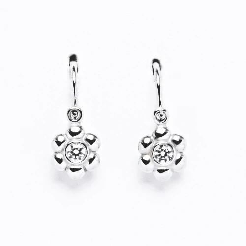 Dětské náušnice ze zlata mají tvar kytičky a jsou zdobeny čirým zirkonem