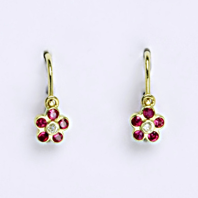 Zlaté náušnice s čirými zirkony a rubíny ze žlutého zlata. Výška náušnice je 12 mm. Orientační váha náušnic je 0,89 g.Hmotnost drahého kovu u tohoto zboží je nižší než 0,5 g za 1 kus ( 1 gram u 1 páru ), a proto je opuncováno ryzostní značkou.