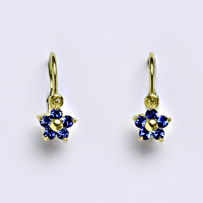 Dětské náušnice ze žlutého zlata se Swarovski krystalem saphire. Celková výška náušnice je 13 mm. Materiál je zlato 585/1000.Orientační váha páru dětských náušnic je 1,03 g.