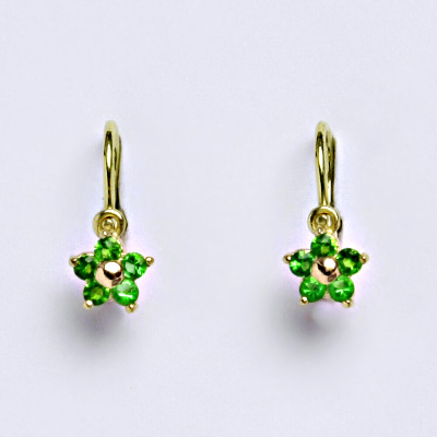 Dětské náušnice ze žlutého zlata se zirkony emerald. Celková výška náušnice je 13 mm. Materiál je zlato 585/1000.Orientační váha páru dětských náušnic je 1,03 g.