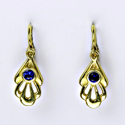 Náušnice jsou vyrobeny ze žlutého zlata 14 karátů 585/1000, jsou zdobeny syntetickým modrým kamínkem, spinelem. Zapínání na náušnicích je na klasické dětské zapínání. Celková velikost náušničky je 18 mm.