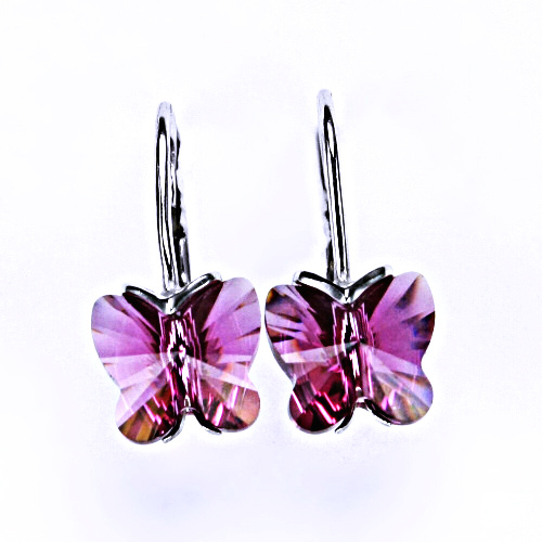 Náušnice s krystaly Swarovski ve tvaru motýlka v barvě Fuchsie.Velikost motýlka je 10mm.Celková délka náušnic - Na tento šperk byla použita povrchová úprava čisté Rhodium,která nezpůsobuje žádné alergické reakce.Motýlek je upevněn nejen krapnami,ale je