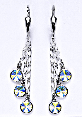 Stříbrné náušnice se třemi Swarovski kolečky zavěšenými na řetízku. Velikost krystalu je 6 mm. Celková délka náušnic je 55 mm. Barva krystalů je AB krystal. Nášnice mají klasické zapínání na patent.