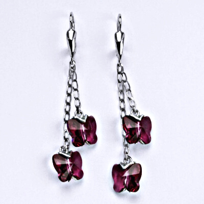 Stříbrné náušnice se dvěma Swarovski motýly zavěšenými na řetízku. Velikost krystalů je 10 mm. Barva krystalů je fuchsia. Nášnice mají klasické zapínání na patent. Celková délka náušnic je 58 mm.