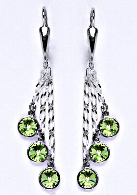 Stříbrné náušnice se třemi Swarovski kolečky zavěšenými na řetízku. Velikost krystalu je 6 mm. Celková délka náušnic je 55 mm. Barva krystalů je peridot. Nášnice mají klasické zapínání na patent.