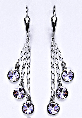 Stříbrné náušnice se třemi Swarovski kolečky zavěšenými na řetízku. Velikost krystalu je 6 mm. Celková délka náušnic je 55 mm. Barva krystalů je violet. Nášnice mají klasické zapínání na patent.