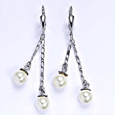Stříbrné náušnice se dvěma Swarovski perlami zavěšenými na řetízku. Velikost perly je 8 mm. Barva perly je white. Nášnice mají klasické zapínání na patent. Celková délka náušnic je 58 mm.