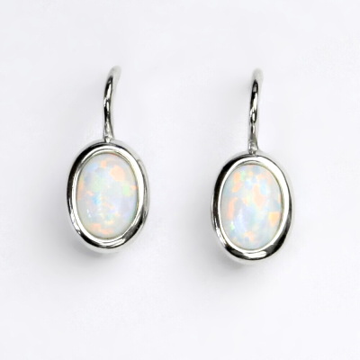 Stříbrné náušnice s bílým syntetickým opálem o průměru 7x5 mm. Materiál je stříbro 925/1000. Orientační váha náušnic je 2,28 g. Náušnice mají zapínání na klapku a jsou rhodiované. Celková výška náušnice je 16 mm.