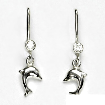 Stříbrné náušnice s delfínky. Náušnice mají zapínání na patent a jsou zdobeny čirým zirkonem. Celková výška náušnice je 25 mm. Materiál je stříbro 925/1000. Orientační váha náušnic je 1,94 g.