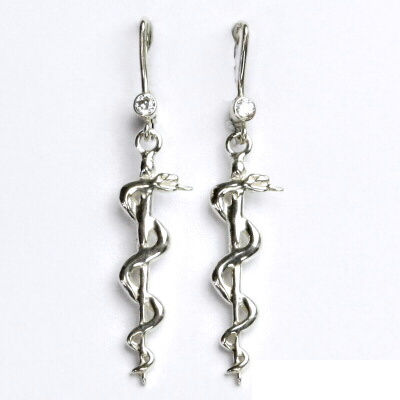 Stříbrné náušnice s lékařským znakem. Náušnice jsou zdobeny čirým zirkonem. Materiál je stříbro 925/1000. Celková výška náušnice je 46 mm. Orientační váha náušnic je 3,36 g.