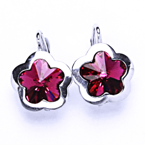 Stříbrné náušnice na klasické patentové zapínání s krystalem Swarovski ve tvaru kytky.Barva- fuschia-červená.Velikost krystalu - 10 mm.Kvalitní přilepení minimalizuje ryziko ztráty.Tyto šperky jsou s povrchovou úpravou - čisté Rhodium, která nezpůsobuj