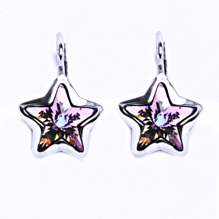 Stříbrné náušnice na klasické patentové zapínání jsou ozdobeny krystalem Swarovski hvězda.Hvězdy mají velikost 10 mm.Barva vitrail light měňavá růžová černá.Tyto šperky mají povrchovou úpravu - čisté Rhodium,které nevyvolává žádné alergické reakce.K tě