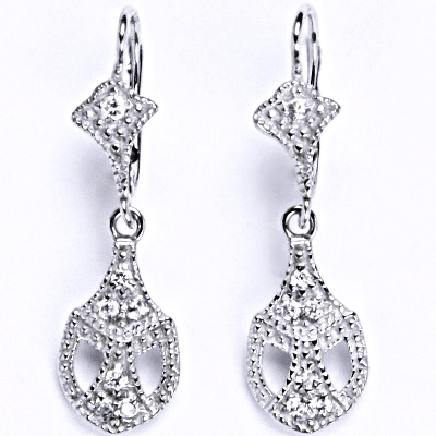 Stříbrné náušnice s čirými zirkony. Celková výška náušnice je 35 mm. Materiál je stříbro 925/1000. Náušnice mají povrchovou úpravu čisté rhodium.