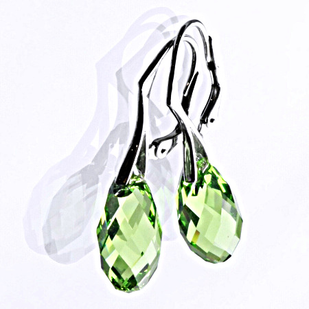 Stříbrné náušnice se Swarovsky krystaly peridot se zapínáním na patent. Velikost krystalu je 17 x 8,5 mm. Celková výška náušnice je 35 mm. Náunice mají povrchovou úpravu čisté rhodium. Materiál je stříbro 925/1000.