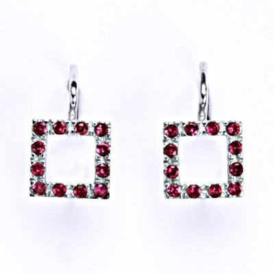 Stříbrné náušnice se syntetickými rubíny. Celková výška náušnice je 15 mm. Materiál je stříbro 925/1000. Náušnice mají povrchovou úpravu čisté rhodium.
