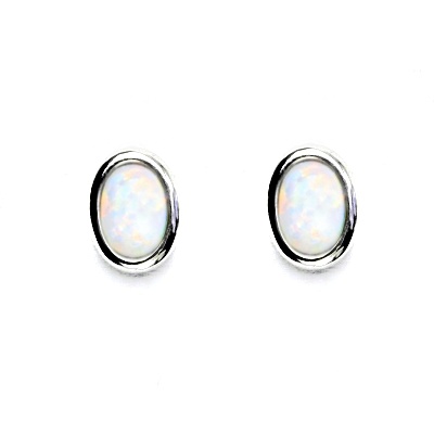 Stříbrné náušnice zdobené syntetickými opály bílé barvy, s bezpečným zapínáním na šroubek. Rozměry kamene jsou 7 x 5 mm, zdobná část měří 9 x 7 mm. Šperk je vyhotoven z rhodiovaného stříbra ryzosti 925/1000, orientační hmotnost 2,06 g.