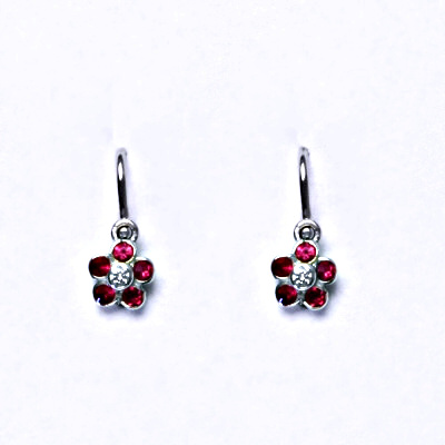 Dětské stříbrné náušnice ve tvaru kytičky mají dětské zapínání. Náušnice jsou zdobeny syntetickými rubíny. Materiál je stříbro 925/1000. Orientační váha je 0,66 g a rozměr je: 5 mm na šířku a celková výška náušnice je 12 mm.