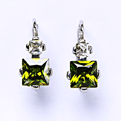 Stříbrné náušnice jsou zdobeny čirým zirkonem o rozměru 3x3 mm a olivínem o rozměru 6x6 mm. Náušnice mají patentové zapínání a povrchovou úpravu čisté Rhodium. Materiál náušnic je stříbro 925/1000.