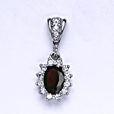 Stříbrný přívěsek s přírodním granátem a čirými zirkony. Velikost kamene je 7x5 mm. Celková velikost je 23 mm. Materiál je stříbro 925/1000. Orientační váha přívěsku je 1,56 g.