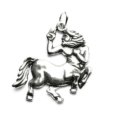 Stříbrný přívěsek ve tvaru mýtické bytosti Kentaur je originálním unisex šperkem symbolizujícím statečnost a sílu. Rozměry přívěsku jsou 28 mm včetně očka na výšku a 25 mm na šířku, orientační hmotnost 2,61 g. Vyhotoveno ze stříbra ryzosti 925/1000. Tato varianta je patinovaná.