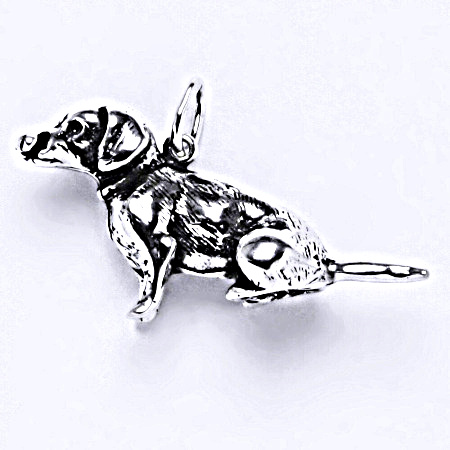 Stříbrný přívešek s patinou. Figurka sedícího psa jezevčíka. Velikost přívěšku je 29 mm na šířku a 15 mm na výšku. Materiál je stříbro 925/1000. Orientační váha přívěšku je 4,45 g.