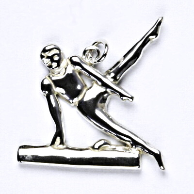 Stříbrný přívěsek ve tvaru gymnasty. Rozměr přívěsku je 25 mm včetně očka a 24 mm na šířku. Orientační váha přívěsku je 2,30 g. Materiál je stříbro 925/1000.