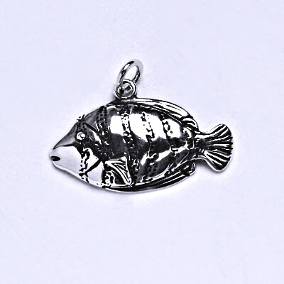 Stříbrný přívěšek korálové rybičky s patinou. Ryzost stříbra je 925/1000. Orientační váha je 1,15 g. Rozměry přívěšku jsou 15 mm na výšku i s očkem a 20 mm na šířku.