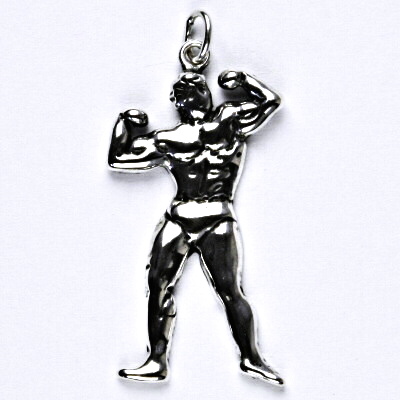 Stříbrný přívěsek ve tvaru kulturisty s patinou. Rozměr přívěsku je je 35 mm na výšku včetně očka a 7 mm na šířku. Orientační váha přívěsku je 2,48 g. Materiál je stříbro 925/1000.