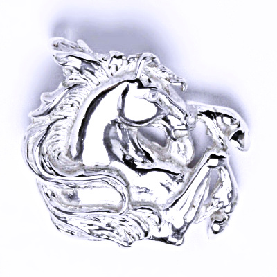 Stříbrný přívěšek ve tvaru koně. Materiál je stříbro 925/1000. Rozměr přívěsku je 29 mm na výšku a 25 mm na šířku. Přívěsek má očka z druhé strany přívěsku. Materiál je stříbro 925/1000. Orientační váha přívěsku je 4,96 g.