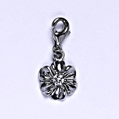 Stříbrný přívěsek ve tvaru kytičky se syntetickým zirkonem. Přívěsek zavěšený na karabině. Celková výška přívěsku je 21 mm. Velikost kytičky je 10 mm. Průměr zirkonu je 2,75 mm. Materiál je stříbro 925/1000.