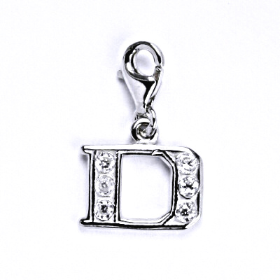 Stříbrný přívěšek ve tvaru písmenka "D" s bílým syntetickým zirkonem. Velikost přívěšku i s karabinkou je cca 20 mm. Materiál je stříbro 925/1000.