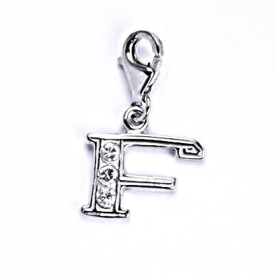 Stříbrný přívěšek ve tvaru písmenka "F" s bílým syntetickým zirkonem. Velikost přívěšku i s karabinkou je cca 20 mm. Materiál je stříbro 925/1000.