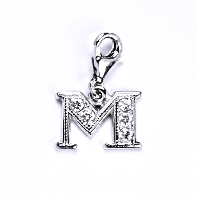 Stříbrný přívěšek ve tvaru písmenka "M" s bílým syntetickým zirkonem. Velikost přívěšku i s karabinkou je cca 20 mm. Materiál je stříbro 925/1000.