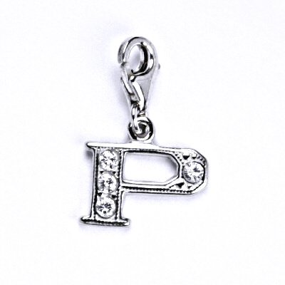 Stříbrný přívěšek ve tvaru písmenka "P" s bílým syntetickým zirkonem. Velikost přívěšku i s karabinkou je cca 20 mm. Materiál je stříbro 925/1000.