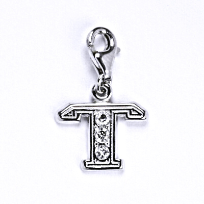 Stříbrný přívěšek ve tvaru písmenka "T" s bílým syntetickým zirkonem. Velikost přívěšku i s karabinkou je cca 20 mm. Materiál je stříbro 925/1000.