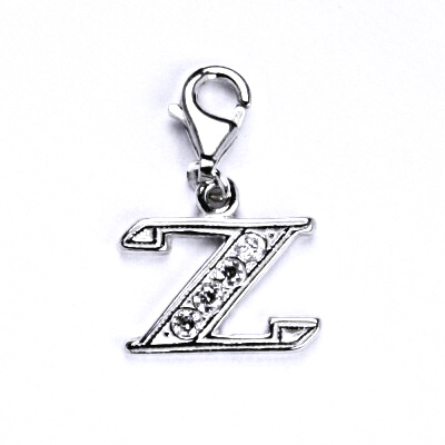 Stříbrný přívěšek ve tvaru písmenka "Z" s bílým syntetickým zirkonem. Velikost přívěšku i s karabinkou je cca 20 mm. Materiál je stříbro 925/1000.