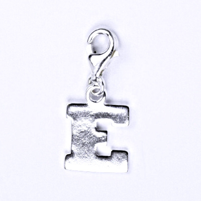 Stříbrný přívěšek ve tvaru písmenka "E" na karabince. Výška písmenka i s karabinou 20 mm. Materiál je stříbro 925/1000.