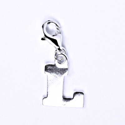 Stříbrný přívěšek ve tvaru písmenka "L" na karabince. Výška písmenka i s karabinou 20 mm. Materiál je stříbro 925/1000.