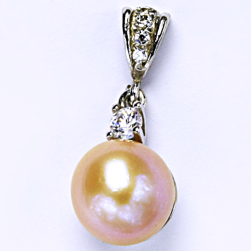Stříbrný přívěsek s přírodní říční perlou lososovou o průměru 12 mm a čirým zirkonem. Materiál přívěsku je stříbro 925/1000.