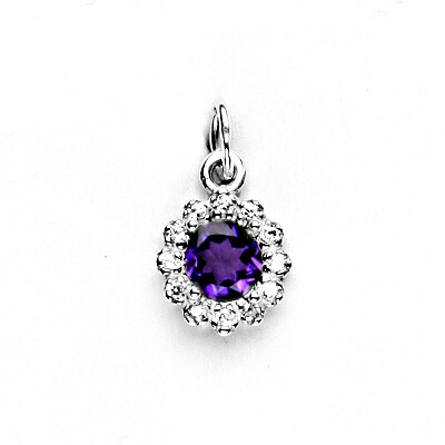 Stříbrný přívěsek ve stylu populárního modelu Kate zdobí přírodní tmavý ametyst o průměru 5,5 mm, po jehož obvodu jsou zasazeny drobné zirkony čiré barvy.