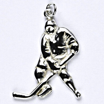 Stříbrný přívěsek ve tvaru hokejisty. Rozměr přívěsku je 30 mm na výšku včetně očka a 20 mm. Materiál je stříbro 925/1000. Orientační váha přívěsku je 1,96 g.
