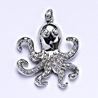 Stříbrný přívěšek s čirými zirkony ve tvaru chobotnice. Velikost přívěšku i se závěsem je 30 mm. Materiál je stříbro 925/1000.