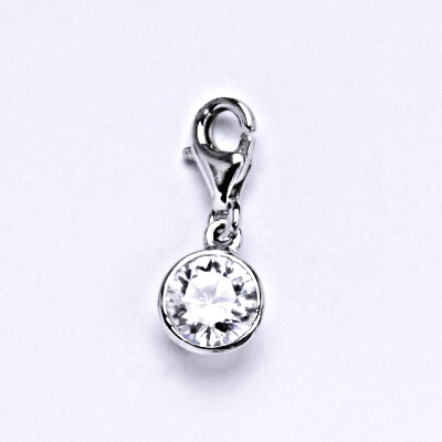 Stříbrný přívěšek se syntetickým čirým zirkonem zavěšená na karabině. Celková výška přívěšku je 17 mm. Materiál je stříbro 925/1000.