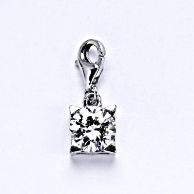 Stříbrný přívěšek se syntetickým čirým zirkonem zavěšená na karabině. Celková výška přívěšku je 17 mm. Materiál je stříbro 925/1000. Orientační váha přívěsku je 1,50 g.