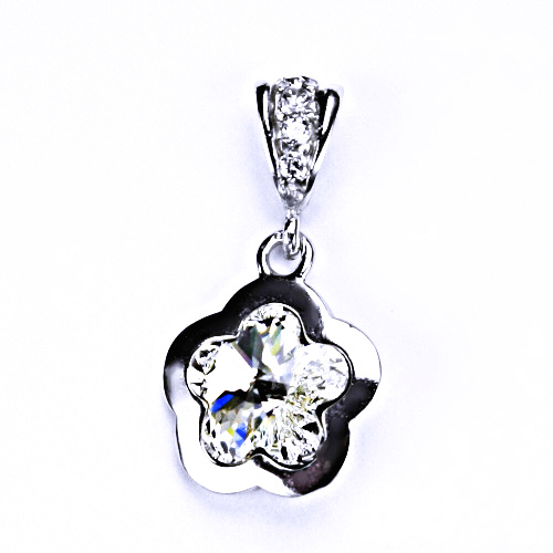Stříbrný přívěsek s krystalem Swarovski ve tvaru kytky.Barva- Crystal - čírá.Velikost krystalu - 10 mm.Kvalitní přilepení minimalizuje riziko ztráty.Tyto šperky jsou s povrchovou úpravou - čisté Rhodium, která nezpůsobuje žádné alergické reakce na nik
