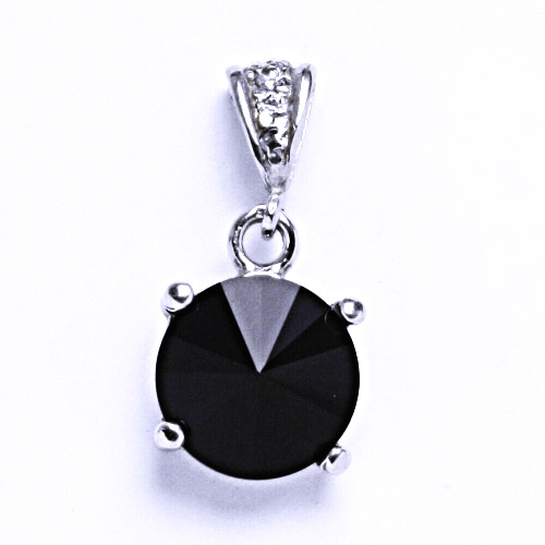 Stříbrný přívěsek s krystalem Swarovski velikosti 12 mm.Barva Jet.V úchytu jsou vsazeny kubické zirkony.Celková délka přívěsku - 23 mm.Tyto šperky mají povrchovou úpravu - čisté Rhodium nezpůsobující žádné alergické reakce.