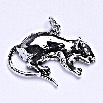 Stříbrný přívěsek s patinou ve tvaru krysi. Celková výška přívěsku je 21 mm. Orientační váha přívěsku je 2,73 g. Materiál je stříbro 925/1000.