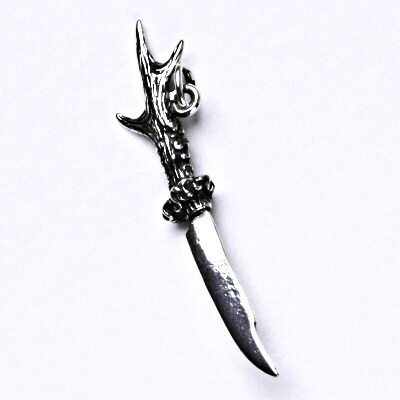 Stříbrný přívěšek s patinou ve tvaru loveckého nože. Velikost stříbrného přívěšku je 39 mm. Materiál je stříbro 925/1000. Orientační váha přívěsku je 1,35 g.