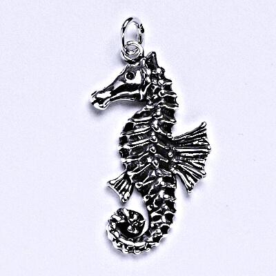 Stříbrný přívěšek s patinou ve tvaru mořského koníka. Celková výška přívěšku je 29 mm. Materiál je stříbro 925/1000.