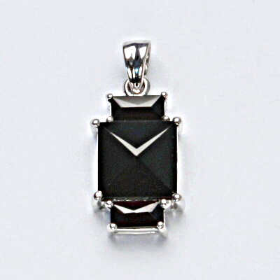 Stříbrný přívěsek je zdoben přírodními granáty. Rozměr přívěsku na výšku je 24 mm včetně očka a na šířku 9 mm. Orientační váha přívěšku je 2,83 g. Materiál je stříbro 925/1000.